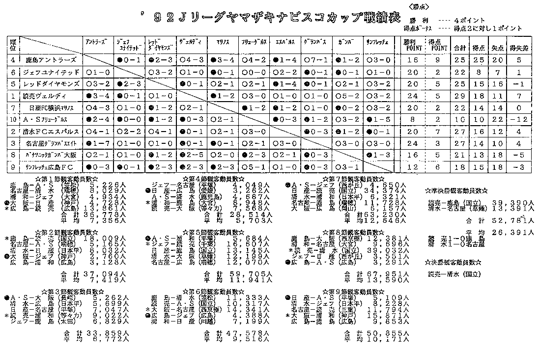 '92 J リーグヤマザキナビスコカップ戦績表
