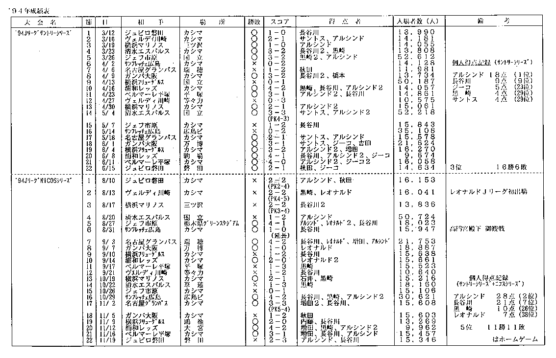 '94 J リーグサントリーシリーズ,NICOS シリーズ戦績表